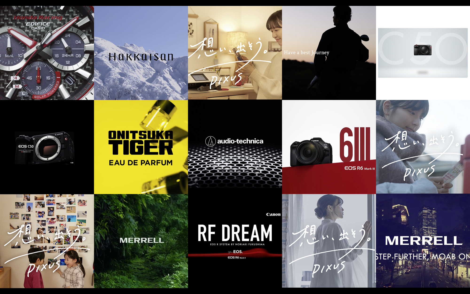 アサヒ飲料 / アサヒビール /AUDIO TECHNICA/ asics / AJINOMOTO / アートネイチャー / AMWAY / ISSEY MIYAKE / イー・モバイル / 伊勢半 / インペリアル・タバコ・ジャパン / UHA味覚糖 /Vidal Sassoon/ EDWIN / NTT docomo / OCN / ONITSUKATIGER / OLYMPUS / 小川香料/ 花王 / CANON INC. / CANON MJ / CASIO / Kracie / クリスピー・クリーム・ドーナツ / GUNZE / HYUNDAI / KOSE / KONAMI / Haagen Dazs / グロワール・ブリエ東京 / RENAULT / サバース / SUNSRAR / 資生堂 / CITIZEN / SHARP / SHU UEMURA / 創味食品/John Masters Organics Group, Inc. / SUNTORY / SERAPIAN / そごう・西武 / SONY / Sony Music Communications /TERUMO/トステム / MERRELL / ナノエッグ / NIKON / 日清紡ホールディングス / 日本コカ・コーラ / NIPPON COLUMBIA / NESTLE/はるやま / FUJI XEROX / 三井不動産 / 三菱UFJニコス / 明治安田生命保険相互会社 / 八海醸造株式会社 / パピレス / Panasonic / パルコ / 富士通 / ミッシェル・エルブラン / 桃屋 / 森永製菓 / ヤマサ / UNIQLO / UCOM / ルミネ / ロート製薬 /L`OREAL PARIS/ WORLD / Warner Music Japan / HEP FIVE / ZOCALO / など他